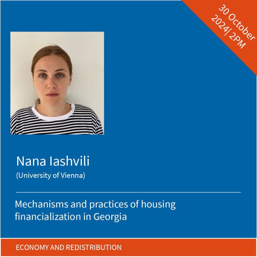 Drawing on her ethnographic fieldwork in Tbilisi, Nana will share her insights on the mechanisms and practices of housing financialization in the post-socialist Georgia. Interested in the broader processes of transformation of housing from a right into a financial asset, Nana’s talk will explore the consequences this transformation has on households, by focusing on the loss of homes as well as the resulting contestations as they unfold in the urban space.